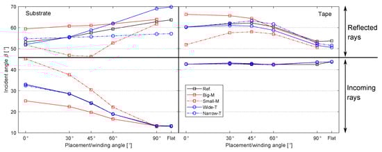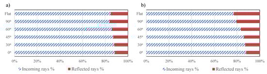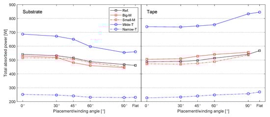 The overview of the corresponding contribution for the total absorbed power from the incoming and reflected rays is shown in Figure 14 for the case Ref and Flat as an example. It is seen that up to 20% of the absorbed power was from the reflected rays for the tape with = 90 and it was approximately 12% for the = 0. It was even slightly more for the Flat case than for Ref-90 as the substrate surface gradient was more toward the tape. The absorbed power by the substrate from the reflected rays was approximately 12–18%.