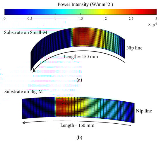 The heat flux distributions on the substrate and tape surfaces were determined by the incident angle of the incoming and reflected rays as well as by the illuminated (and heated) area by the incoming and reflected rays. The mean of for each case study listed in Table 3 was calculated using the optical model and the obtained results are shown in Figure 11. It is seen that the mean of is always smaller than for the incoming rays and the mean of is always larger than for the reflected rays for both tape and substrate. It was found that for the incoming rays of the substrate gradually decreased from a range of 25–45 to a constant value of 14 with an increase in from 0 to 90, mainly due to the change in the surface curvature. The decrease in was the most significant for the case Small-M due to a greater curvature, leading to much higher values of . On the other hand, of the incoming rays on the tape remained almost the same at approximately 42 since the tape geometry was not changed with . In addition, the incoming rays with relatively high values covered a larger area on the tape than the substrate. This resulted in a larger heated area on the tape surface with higher laser intensity distribution which can be seen from Figure 10 as well. There was a gradual increase in the mean of for the reflected rays of the substrate coming from the tape and roller with an increase in due to the fact that a larger amount of reflected rays hit the substrate surface. Similarly, the tape received larger amounts of reflected rays as decreased because a larger amount of rays reflected towards the ambient environment and not to the tape when decreased. This can also be seen from the heat flux distribution for the case Ref displayed in Figure 10 such that at = 90 locally a higher intensity is approximately between 60–70 mm before the nip line as compared with 0 for the tape. The corresponding total absorbed powers by the substrate and tape for each case are shown in Figure 12. It is seen that the total power absorbed by the substrate gradually decreases with an increase in mainly due to a reduction in the mean . On the other hand, this trend was found to be the opposite for the tape, although the mean of remained the same. The reason behind this was the increase in the intensity of illuminated or heated area for the tape by the number of reflected rays coming from the substrate as increased. The case Wide-T had the largest absorbed total power for the substrate and tape since the heated area was the largest for this case. The influence of the mandrel size on the power intensity distribution of the substrate is illustrated in Figure 13. It is seen that a more localized power intensity distribution occurred for the Small-M due to higher laser incident angles on the substrate. This localized behavior on the Small-M which took place near the nip line caused a smaller heat loss from the irradiation location until the nip line via the convection than the corresponding heat loss of the Big-M.