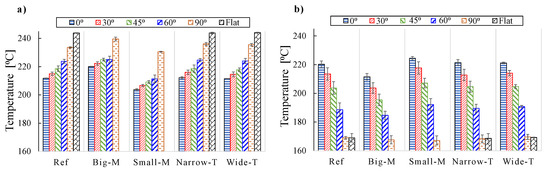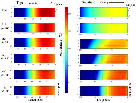 The predicted temperature distributions on the tape and substrate surfaces are shown in Figure 15 for the case Ref and Flat. The more localized absorbed laser intensity on the tape due to the reflections from the substrate resulted in higher temperature values which can be seen in Figure 15 for the cases Flat, Ref-90 and Ref-60. The substrate temperatures increased with a decrease in due to an increase in the laser incident angle and stronger light absorption. On the other hand, the tape temperature decreased with a decrease in because less reflections from the substrate to the tape took place for lower values with respect to the winding/placement curvature. The temperature at the nip line was found to vary between 200 C–250 C for the tape and 160 C–220 C for the substrate. The higher tape temperature as compared with the substrate was mainly due to the higher incident angle of the tape (see Figure 11) as also discussed in Section 5.2.1.