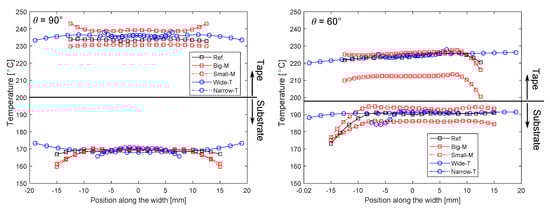The temperature distributions at the nip line were further investigated in detail for each case study since the nip line temperature played an important role on the bonding quality of the tape and substrate as aforementioned. To illustrate, the temperature distribution along the nip line is shown in Figure 16 for each case with = 90 and = 60. It is seen that there is a temperature variation along the nip line for the tape and substrate mainly due to mandrel curvature, laser divergence, laser reflections from tape and roller, that is, the tape had a larger refractive index than the roller. This effect can be easily distinguished for the cases Narrow-T and Wide-T where Narrow-T had more reflections from the roller than Wide-T.