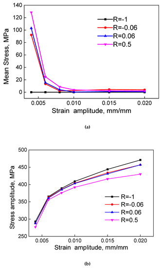 To recognize the relationship between stress and strain under different strain ratios, experimental data of 2124-T851 aluminum alloy from [16] are presented in Figure 1. The experiment was carried out by strain-controlled method at a constant total strain rate of 0.004 s−1 at room temperature. Since the mean stress and the stress amplitude are the two factors usually considered as the control parameters in mean stress-based fatigue models, two diagrams are reproduced as the mean stress versus the strain amplitude (Figure 1a) and the stress amplitude versus the strain amplitude (Figure 1b) under four levels of strain ratios.