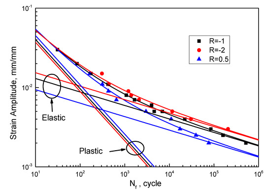 where and are the Elastic strain amplitude and plastic strain amplitude of the hysteresis loop for one cycle failure, respectively. The total strain energy required for failure is a certainty [21]. The change of strain ratio leads to a change in the proportion of elastic strain energy and plastic strain energy for one cycle failure. Accordingly, the strain ratio will affect the values of and . However, most current fatigue models only focus on , and the lack of consideration for may have adverse effects on the life prediction, especially for high-amplitude strain.