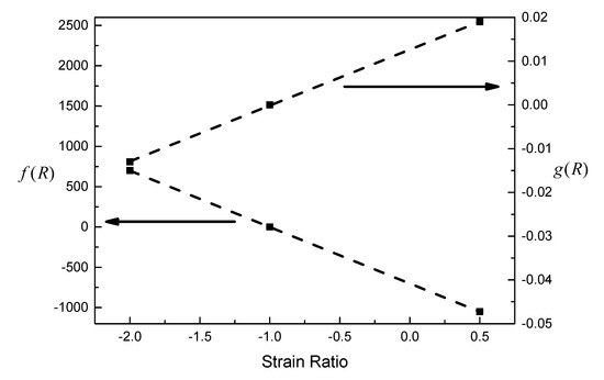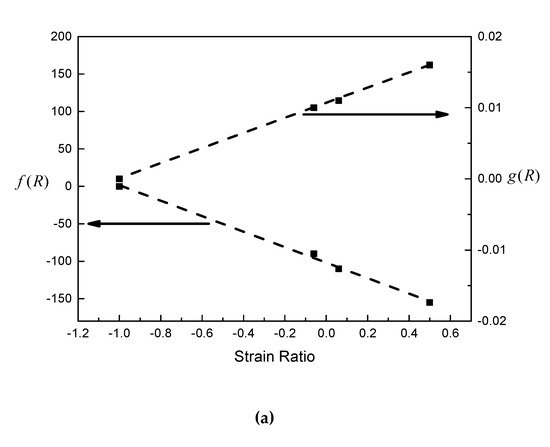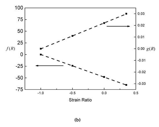 It can be seen from Figure 5 that the prediction curve fits well with the experimental data, and the slopes of the elastic and plastic lines do not change with strain ratio. As shown in Figure 6, the corrected fatigue strength coefficient, f(R), and the corrected fatigue ductility coefficient, g(R), are both linearly correlated with the strain ratio.