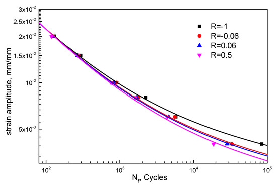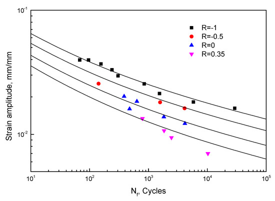It can be seen that most works on LCF models were done on the mean stress correction. However, the mean stress affected by cyclic softening or hardening changes with loading cycles and will lead to errors in life prediction [14,15]. In high cycle fatigue (HCF), the mean stress can be simply calculated by the stress ratio. However, the mean stress and strain amplitude cannot be obtained at the same time, which leads to extra effort in life prediction in engineering applications. In addition, how the strain ratio could affect the mean stress and life prediction depends on loading conditions, i.e., the strain ratio and the strain amplitude. It would be more convenient for LCF life prediction to use a directly controlled factor, such as the strain ratio, rather than an intermediate parameter, such as the mean stress. Wang [11] proposed a strain ratio-based LCF model, of which the model parameters need at least three groups of fatigue data at different strain ratios.