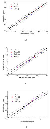 The effect of mean stress on fatigue life depends on the direction. For a tension–compression case (R < 0), the compressive stress has a beneficial effect by extending the fatigue life, while the tensile stress takes the main response for the fatigue damage accumulation. Under this consideration, a lower strain ratio means a larger compressive stress, which leads to a longer fatigue life, and vice versa. The Manson–Coffin model does not consider the mean stress effect, so the life prediction will be higher than the experimental data for R = 0.5 due to the existence of tensile mean stress. Aside from the Manson–Coffin model, other models show a common feature that the predictions are smaller than the experiment results in lower strain ranges. This is because the mean stress corrections in these models are over-considered when the mean stress raises rapidly with decreasing strain amplitude. In particular, for mean stress-based models, the deviation of prediction is strongly affected by the correction intensity of mean stress as shown in Figure 3. It is why the Goodman model has the lowest predictions and the Morrow model gives relatively high results.