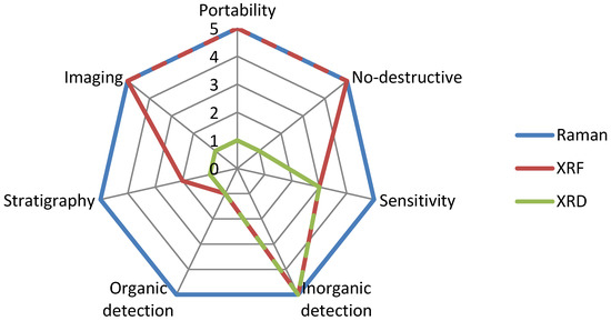 To compare Raman, XRF, and XRD techniques we merely reported some relevant characteristics on a 1 to 5 scale in Figure 1. As evidenced by the graph, albeit the complementarity of these techniques, Raman spectroscopy shows numerous advantages with respect to the other two techniques.