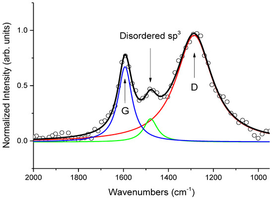Simulated D (red), G (blue), and disordered sp3 (green) bands in Amorphous Carbon detected in clay samples from Khirbat Iskandar. Ratio between areas and intensities of D and G bands were used to determine production parameters of clay. (Reproduced from work in [25] with the permission of Elsevier, copyright 2018.).