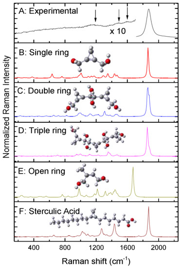 By using DFT calculations, as reported in Figure 3, we simulated the degradation process of the hypothesized initial oil and proposed the attribution of the final compound revealed by Raman analysis.