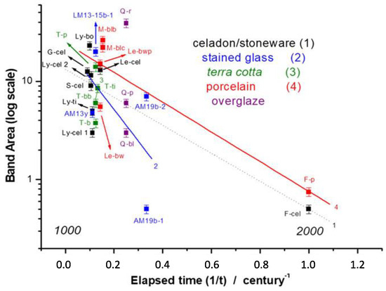 As evidenced in Figure 4, regression lines are proposed in the semi-log plot to show the different time trend for the different groups, such as the celadons or stoneware, the reference stained glasses, the glazed terra cottas, porcelains, and porcelain overglazes, thus allowing the authors to achieve a dating model for the examined samples.