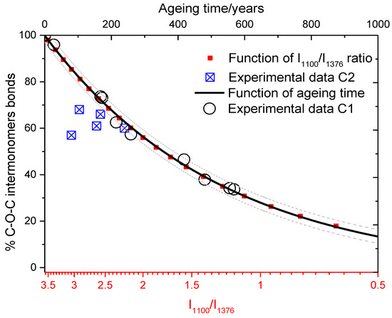 The prediction of the model is reported in Figure 5, where the calculated residual percentage of C–O–C inter-monomer bonds is shown as a function of the ratio , obtained as above illustrated, in the corresponding scale between t = 0 and t = 1000 aging years. The figure displays also some blue points derived from degraded paper, affected by foxing phenomenon and showing how this effect produces an accelerated aging of the reported samples. The estimated aging time was in very good agreement with the experimental data with 8% of accuracy.