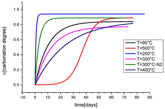 where α is the degree of carbonation; τ indicates the characteristic time of the process; and γ, representing the asymptotic value in the graph of Figure 6, corresponds to the maximum carbonation relative value.