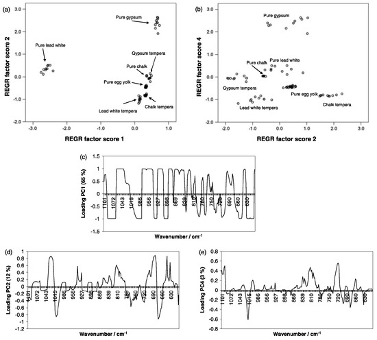 As evidenced in the work proposed by Navas et al., three principal components, PC1, PC2, and PC4, were determinant to the discrimination procedure. In particular, the contribution of each of the three white pigments is observed in the PC1 loading plot (maxima and minima associated to all single reference compounds). The PC2 loading plot clearly indicates the contribution of the gypsum-laden samples (minima at 1007 cm−1 for example) and from the loading plot of PC4, the preeminent contribution of chalk is retrieved (see maximum at 1087, 811, and 717 cm−1). Through this approach, single contribution of reference pigments was determined and can be exploited for tracing and authenticity purposes.