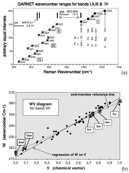 Experimental data determined by Smith et al. and the application of RAMANITA method: (a) plot of wavenumbers of bands I–IV for the garnet system Pyr–Alm–Spe–Gro–And–Uva; (b) the WV diagram for band VII in the Pyr–Alm–Spe–Gro–And–Uva garnet system. (Reproduced from [39] with the permission of Elsevier, copyright 2005).