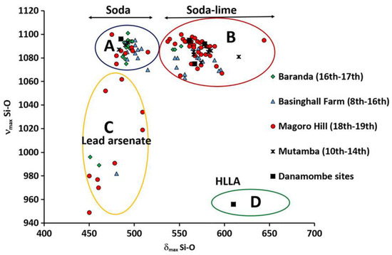 Classification of glass from Raman spectra is achieved by reporting the large stretching vibration signal of SiO4 (in the 1000 cm−1 range) as a function of the bending peak maxima (in the 500 cm−1 range) as reported in Figure 9. This plot indicates the perturbation on the SiO4 tetrahedron exerted by adjacent ions (sodium, potassium, lead, and calcium) and the degree of polymerization. The classification was formerly applied to southern African beads recovered at Danamombe, Basinghall Farm, Mutamba, Magoro Hill and Baranda sites, producing four distinctive groups: Soda cluster (A), Soda-lime cluster (B), Lead arsenate cluster (C), and lime/potash cluster (D) having high lime and low alkali content (HLLA).