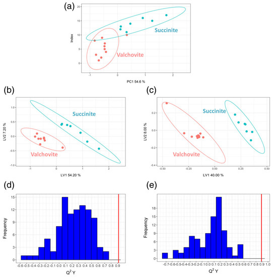 PCA-scores and PLS-scores plots of analyzed succinite and valchovite ambers (a–c). Panel (c) refers to the 1100 to 1800 cm−1 range. Density plot of the Q2Y values account for the full vibrational spectra (d) and the 1100 to 1800 cm−1 range (e). (Reproduced from work in [41] with the permission of Wiley, copyright 2017.)