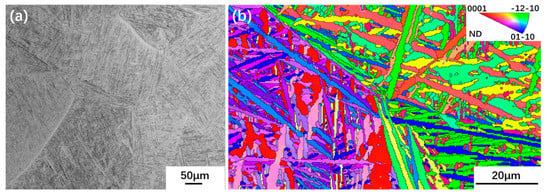 Microstructure (a) and inverse pole figure (IPF) map (b) of the as-received Ti65 alloy billet.
