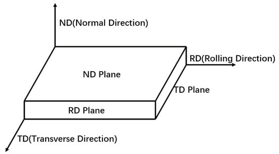 Three-dimensional representation of RD, TD, and ND planes in the rolled sheet.