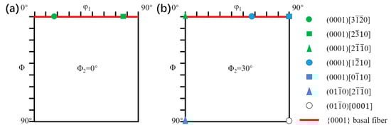 Texture measurements on ND plane of samples were carried out by using D8 Advance X-ray diffractometer (BRUKER, Karlsruhe, Germany). Because of less volume fraction of β phase in Ti65 alloy at room temperature, it can be conferred the measured texture belongs to α phase. For XRD, three pole figures (0001), (), and () of α phase were measured in a 5° by 5° grid. Complete orientation distribution function (ODF) maps were calculated based on obtained pole figures by HKL Channel 5 software. Due to the symmetry of HCP crystal structure, only the ODF plots of constant Φ and section with = 0° and = 30° in Euler space defined by three Euler angles, i.e., , Φ and , are presented. The standard = 0° and = 30° ODF maps calculated by Equation (1) [28] are shown in Figure 3a,b respectively, where (HKIL)[UVTW] are miller indices and {φ1Φφ2} are Euler angles.