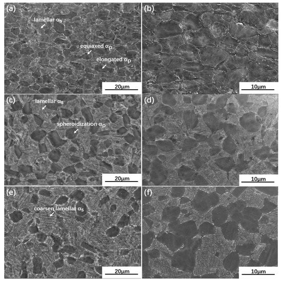 Scanning electron microscope (SEM) images of UDR Ti65 alloy sheets: (a,b) UDR; (c,d) UDR-600 and (e,f) UDR-700. (a,c,e) are SEM images of RD plane of samples of and (b,d,f) are of TD plane.