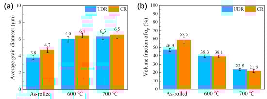 The SEM images of UDR samples and CR samples are separately shown in Figure 4 and Figure 5. The images of the UDR sample reveal the presence of equiaxed structure consists of equiaxed , lamellar and a few elongated , which are marked by an arrow. Simultaneously, elongated grains rather than equiaxed grains are dominant in the CR sample, which can be inferred from Figure 5a,b, indicates the benefit of CR process to homogeneous deformation, which may lead to less formation of cracks during hot rolling. The average α grain diameter of UDR samples shown in Figure 6a are finer than CR samples, and the volume fraction of of UDR samples shown in Figure 6b are less. Compared to as-rolled samples, the microstructures of both UDR-600 and CR-600 samples transform to duplex microstructure, with spheroidized , lower volume fraction of but higher average grain diameter. The average grain diameter of UDR and CR samples increases further with heat treatment temperature rising to 700 °C, but with lower difference. The volume fraction of decreases, and more significant spheroidization response of is observed. The formation rate of during phase transformation is affected by diffusion rate of solute atoms [29], and hence increasing aging temperature can coarsen lamellar by facilitating diffusion of solute atoms, which is in line with that the width of lamellar increases from ~0.2 µm in the UDR-600 sample to ~0.4 µm in the UDR-700 sample and ~0.15 µm in the CR-600 sample to ~0.35 µm in the CR-700 sample.