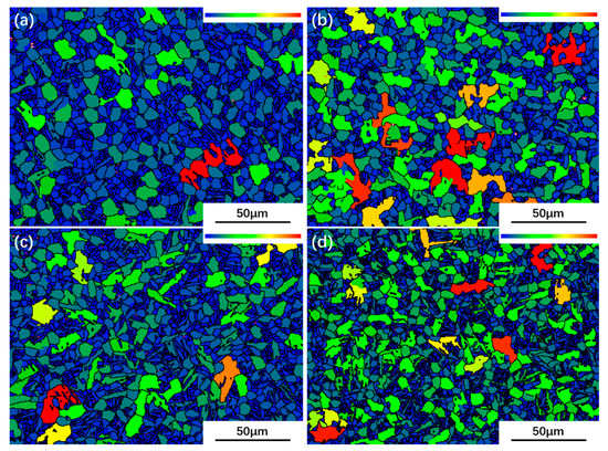 Maps of grain size of Ti65 alloy sheets: (a) UDR-600; (b) CR-600; (c) UDR-700 and (d) CR-700. Grains with maximum size are marked as red, and grains with minimum size as blue.
