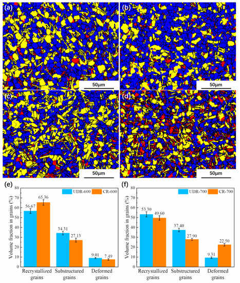 Recrystallization maps of Ti65 alloy sheets: (a) UDR-600; (b) CR-600; (c) UDR-700; and (d) CR-700. Recrystallized grains are marked as blue, substructure grains as yellow and deformed grains as red. Recrystallization diagrams of (e) 600 °C samples and (f) 700 °C samples.