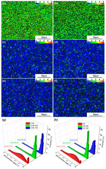 The KAM maps obtained by calculating the average orientation differences between adjacent points can show the average local misorientation below the subgrain angle, and hence represent and locate deformed region and dislocation density [7] Regions with high KAM are colored as red, and regions with low KAM as blue. Due to high strain, KAM maps of the UDR sample and the CR sample, as shown in Figure 10a,b, both are full of green regions, with lots of yellow or even red regions, which demonstrates high density dislocation, but the average KAM value of the CR sample (1.76) is less than the UDR sample (1.97). Due to more active slip system, there is less dislocation accumulation in the CR sample, and hence with low dislocation density. The average KAM value of the UDR-600 sample is the same as the CR-600 sample, with number of 0.37, which means that it is more effective for UDR samples to decrease dislocation density during the same heat treatment, which is attributed to more stored energy in the UDR sample. The average KAM value of the UDR-700 sample is nearly the same as the UDR-600 sample, but it rises from 0.37 in the CR-600 sample to 0.47 in the CR-700 sample, which is attributed to the decrease of the fraction of recrystallized grains.