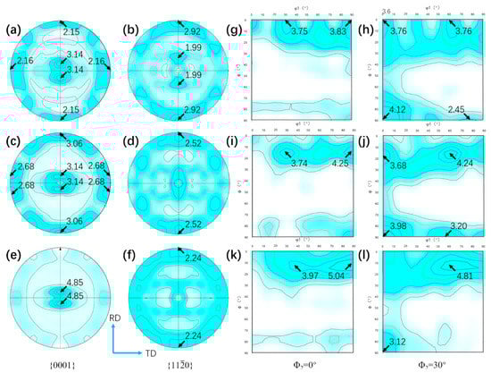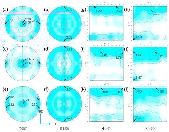 and pole figures and ODF maps of UDR Ti65 alloy sheets: (a,b,g,h) UDR; (c,d,i,j) UDR-600; and (e,f,k,l) UDR-700.