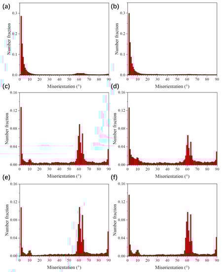 Distribution of α grain boundary misorientation of Ti65 alloy sheets: (a) UDR; (b) CR; (c) UDR-600; (d) CR-600; (e) UDR-700; and (f) CR-700.