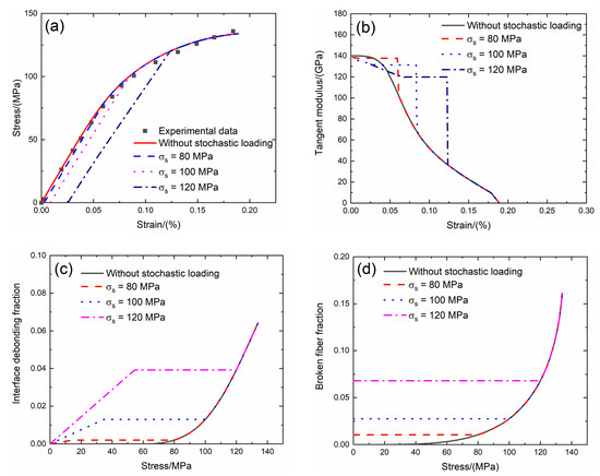 Figure 16. (a) The tensile stress–strain curves; (b) the tangent modulus versus strain curves; (c) the interface debonding fraction versus stress curves; and (d) the broken fibers fraction versus stress curves of 2D SiC/SiC composite for conditions without stochastic loading and with stochastic loading of σs = 80, 100 and 120 MPa.