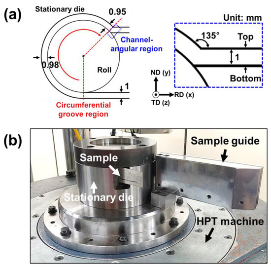 In this work, a commercial copper sheet with high purity (99.99%) was employed as a workpiece subjected to the SRAR process. The dimensions of the copper sheet were 300 × 28 × 1 mm3, and the sheet was firstly annealed at 600 °C for 2 h to initialize its microstructure. Afterward, the SRAR was carried out at room temperature. The SRAR die used in this study was identical to that in our previous works [14,15,16], whose details are illustrated in Figure 1a. By the friction from the rotary roll, the copper sheet passed through a specially designed groove inside the stationary die. The thickness of the entry groove was designed to be 1 mm, equal to the initial thickness of the copper sheet. The groove thickness gradually decreased to 0.95 mm through the circumferential groove region surrounding the rotating roll. The channel-angular region was devised such that the exit groove intersected the circumferential groove at an angle of 135°. The thickness of the exit groove was designed to be 1 mm to restore the original thickness of the copper sheet by elastic recovery and repulsive force in the channel-angular region. In this work, the SRAR process was customized for the high-pressure torsion (HPT) facility, as shown in Figure 1b. A rotary lower anvil of the HPT machine was used as the roll of the SRAR process, and rotational speed was set to 3 rpm. In addition, a sample guide was installed to prolong the exit groove and alleviate sample deflection by residual stress. The SRAR process was repeated up to six times in two types of processing routes, called ‘route A’ and ‘route C’ in the conventional ECAP process [17]. For convenience, the SRAR-processed samples are referred to in accordance with the number of passes and the processing route (e.g., the sample processed by six passes in route A was named as 6pA). In this work, the number of passes was limited to six passes due to a lack of torque in the HPT machine.