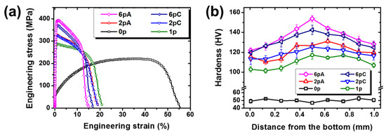 (a) Tensile stress–strain curves and (b) Vickers hardness distributions along the thickness, depending on the number of passes and the processing route.