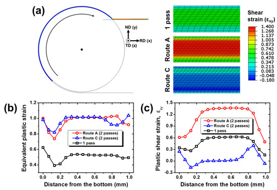 The mechanical and microstructural heterogeneities in routes A and C were interpreted in terms of equivalent plastic strain and shear strain, using the finite element analysis, as shown in Figure 5. In the first pass, the core region involved uniformly distributed equivalent strains, as represented in Figure 5b. However, both surface regions contained relatively low equivalent strain, especially near the bottom region. This heterogeneous equivalent strain distribution calculated by FEM was in good agreement with the experimental trend of hardness in Figure 3b. Above all, the shear strain distribution after the first pass in Figure 5c proved that the SRAR process dramatically split the level of shear strain between the core and surface regions. The heterogeneous shear distribution resulted from the superposition of three types of shear deformation: CSD, CASD, and frictional shear deformation [15]. The CSD at the circumferential groove region concentrates negative shear strain (εxy < 0), mainly on the bottom surface of the workpiece. The CASD is the same deformation as the simple shear in the conventional ECAP process in that it derives a substantial amount of positive shear strain (εxy > 0) uniformly over the entire thickness under an ideal condition. However, the friction between the workpiece and the stationary die induces additional negative shear strain (εxy < 0) in the vicinity of the top surface during CASD [37]. Accordingly, the CSD and the frictional effect alleviate the positive shear strain by CASD on both surfaces, leading to the shear strain partitioning between the core and surface regions after a single pass of the SRAR process.
