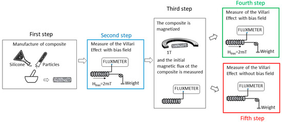 In order to study the influence of the elastic and magnetic properties of composites on their Villari response, the measurements have been carried out in different steps, as shown in Figure 2.