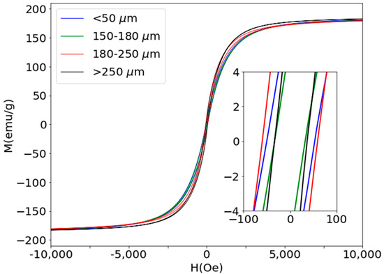 Figure 5 shows the images of the composites make with the different sizes of particles used. The photographs show a certain dispersion in shape and size of the particles. The images also show a random distribution of the particles in all the composites, and therefore the shape anisotropy due to the non-rounded particles would be averaged, resulting in the isotropic composites. No aggregates are observed that could contribute to an increase in the coercive field of the composites [48]. The different distribution of sizes observed would explain the behavior of the coercive field.