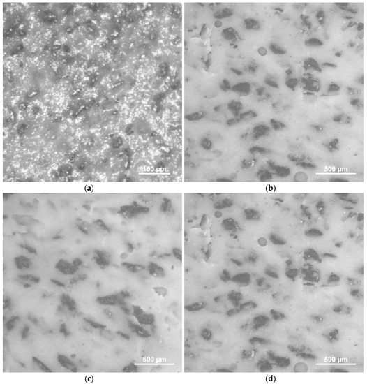 Optical micrographs showings microstructure of Fe81Ga19/silicone composites with particles size: (a) <50 µm and content of 45 wt.%; (b) 150–180 µm; (c) 180–250 µm; (d) > 250 µm and content of 60 wt.%.
