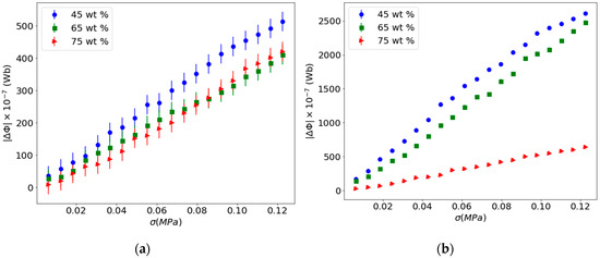 Figure 6a shows few differences between the Villari signals obtained for the different manufactured composites. After being submitted to the magnetic field of 1 T, in Figure 6b it can be observed a dramatic increase in the Villari signal corresponding to the composites of 45 wt.% and 65 wt.%, while for the 75 wt.% a slight difference is observed.