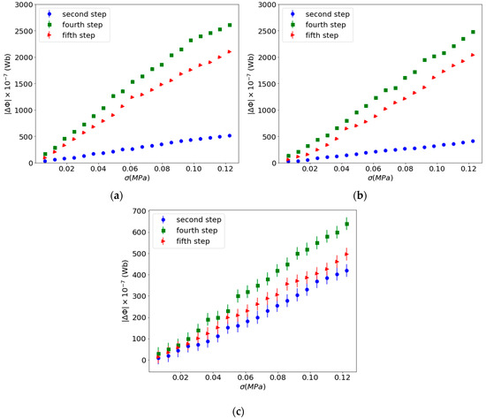 Results of the Villari effect in the different steps of the experiment: (a) Composites with 45 wt.%; (b) composites with 65 wt.%; (c) composites with 75 wt.%.