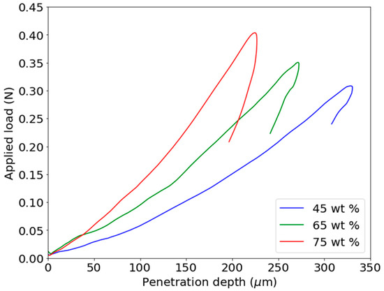 In Figure 8, the P-h loading and unloading curves of the composites filled with 45, 65 and 75 wt.% of magnetic particles are shown.