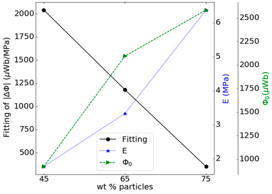 As in the previous section, the Villari signals from these samples have again been adjusted using a quadratic function and the results of the adjustment slope together with Young’s modulus and the initial magnetic flux are shown in Figure 11.