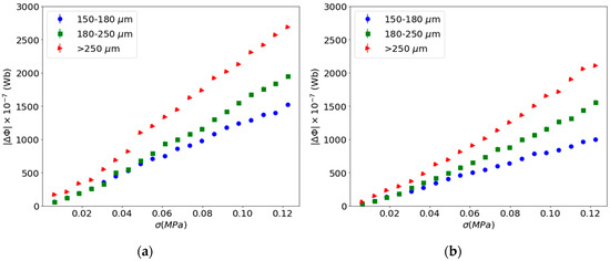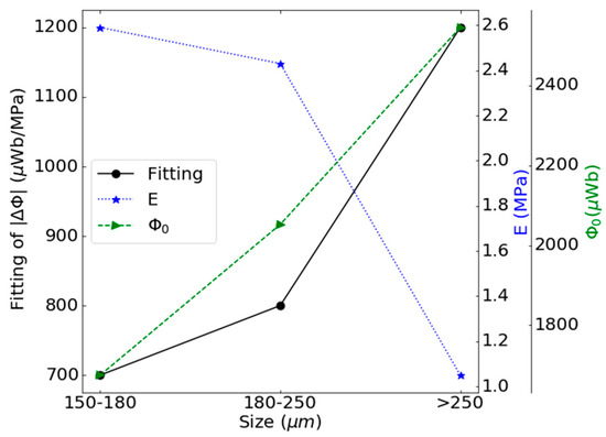 In this case, the increase in the size of the filler particles produces a decrease in the Young’s modulus and an increase in the initial magnetic flux of the composites, which favors the increase in the strain-Villari effect, as shown in the Figure 11.