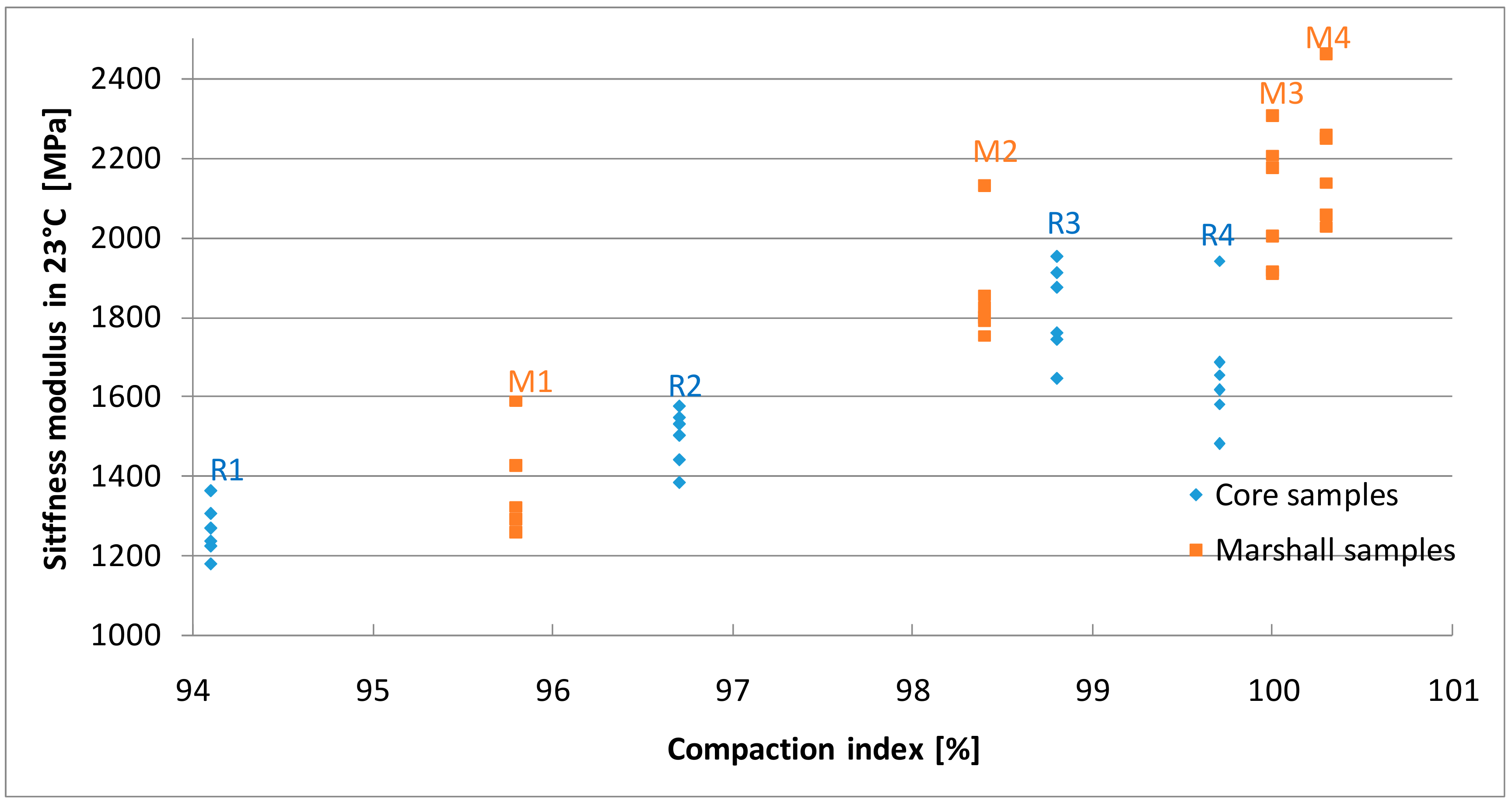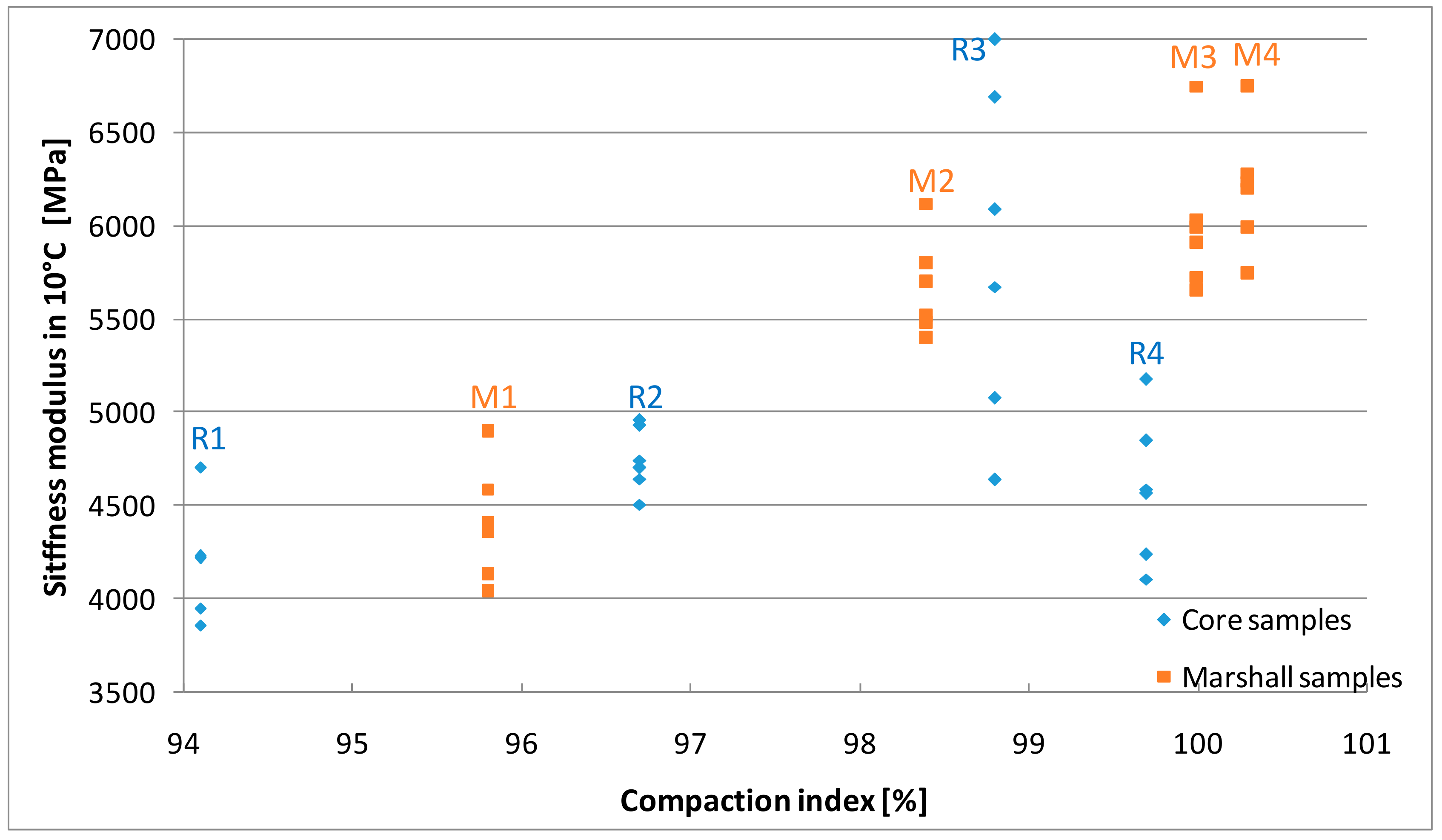| Compaction Index (%) | Stiffness in 23 °C (MPa) | Standard Deviation | Stiffness in 10 °C (MPa) | Standard Deviation | Stiffness in −2 °C (MPa) | Standard Deviation | ||