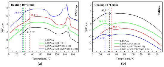 The transition temperatures and enthalpies of the investigated polymers and compositions determined by differential scanning calorimetry (DSC) are presented in Table 1. DSC thermograms of the L,D-PLA without and with 5CB, SWCN, and 5CB:SWCN, as an example, obtained during heating and cooling, under a N2 atmosphere, are shown in Figure 1. Results of the DSC measurements for other polymers and their compositions are presented in Supplementary Materials Figure S1. As one can see, the addition of 5CB and/or SWCN does not change the character of the phase transition in each studied hybrid layers. Small shifts in the transition temperatures occurred for all the hybrid layers and were the most noticeable for PCL (see Tonset in Table 1).