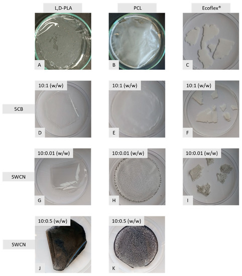 Photos of the created polymer layers by the drop-casting method: polymers L,D-PLA (A), PCL (B), Ecoflex® (A–C), polymers with 5CB in a ratio of 10:1 (w/w) (D–F), polymers with SWCN in a ratio of 10:0.01 (w/w) (G–I), and polymers with SWCN in a ratio of 10:0.5 (w/w) (J,K).
