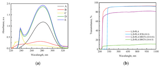 Absorption UV–Vis spectra of L,D-PLA and its compositions, 5CB and SWCN in chloroform with isosbestic points, where A—5CB; B—SWCN; C—L,D-PLA; D—L,D-PLA:5CB (930:1); E—L,D-PLA:5CB (930:1:3.8) (a) and the transmittance of L,D-PLA and its compositions (b).