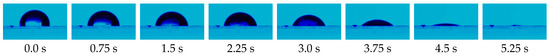 In addition, for the Ecoflex® layers, with and without additives (5CB or SWCN), a rapid sorption of deposited water drop was observed, as it is presented in Figure 7. A visible drop in the volume of droplet was observed for different time periods, starting from the moment the water droplet came into contact with the surface. The droplet spread completely over the film surface after five seconds from deposition.