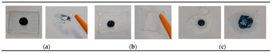 Photo of L,D-PLA (a), PCL (b) and Ecoflex® (c) with poly(3,4-ethylenedioxythiophene):poly(styrenesulfonate) from water (left side) and toluene (right side).