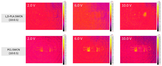 Thermal images for films composed of L,D-PLA, and PCL with SWCN at the ratio 10:0.5 w/w at 2.0 V, 6.0 V, and 10.0 V.