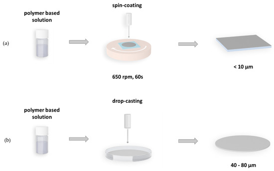 Scheme of layer preparation using the spin coating (a) and drop casting (b) techniques.