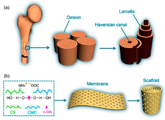 - Jiang, H.; Zuo, Y.; Zou, Q.; Wang, H.; Du, J.; Li, Y.; Yang, X. Biomimetic Spiral-Cylindrical Scaffold Based on Hybrid Chitosan/Cellulose/Nano-Hydroxyapatite Membrane for Bone Regeneration. ACS Appl. Mater. Interfaces 2013, 5, 12036–12044. [Google Scholar] [CrossRef]